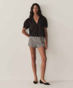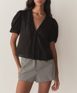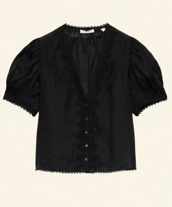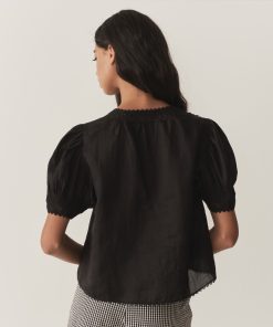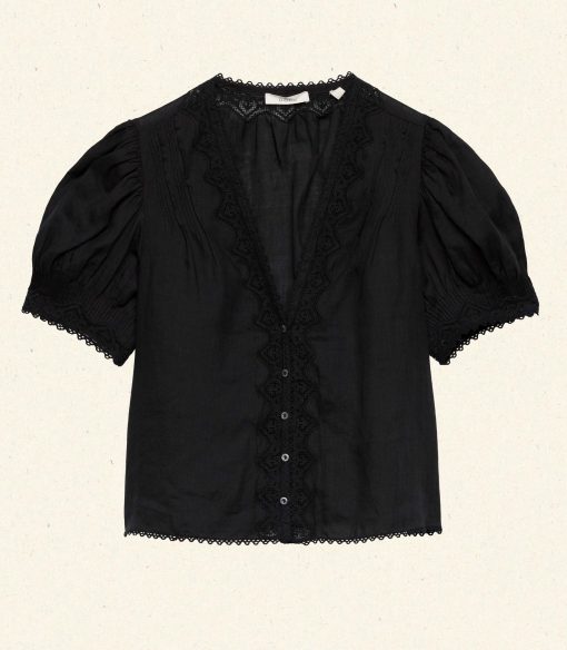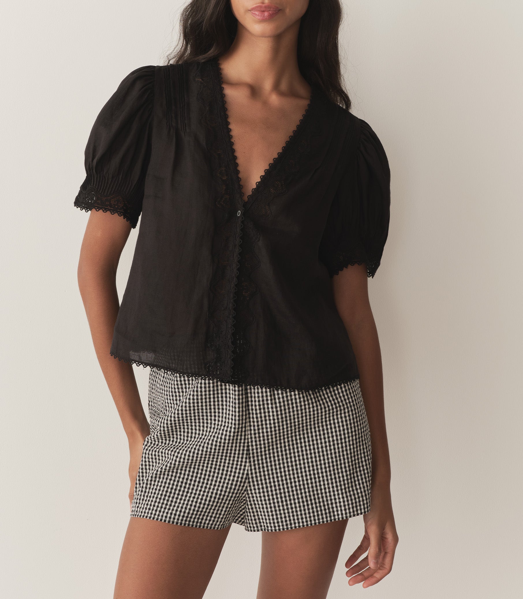 Crafted from a lightweight ramie, the Victorian-inspired Brigitta Top features a plunging V-neckline, short puffed sleeves with clustered pintucks, and intricate lace detailing. A line of starburst buttons extends down the center front. Wear it loose, or tuck it into your favorite high-waisted jeans.