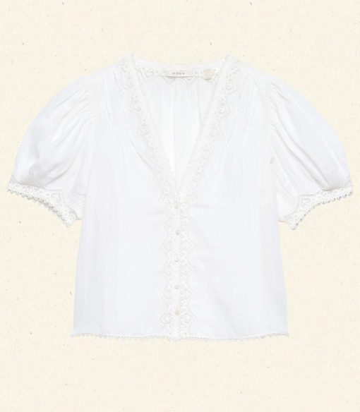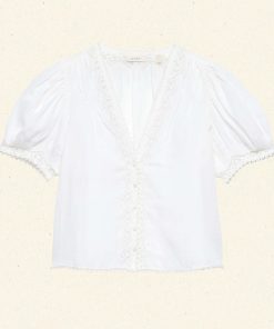 Crafted from a lightweight ramie, the Victorian-inspired Brigitta Top features a plunging V-neckline, short puffed sleeves with clustered pintucks, and intricate lace detailing. A line of starburst buttons extends down the center front. Wear it loose, or tuck it into your favorite high-waisted jeans.