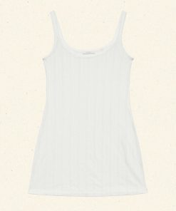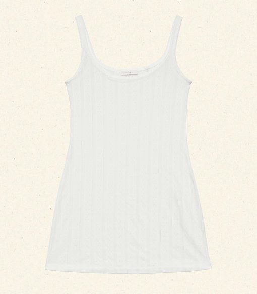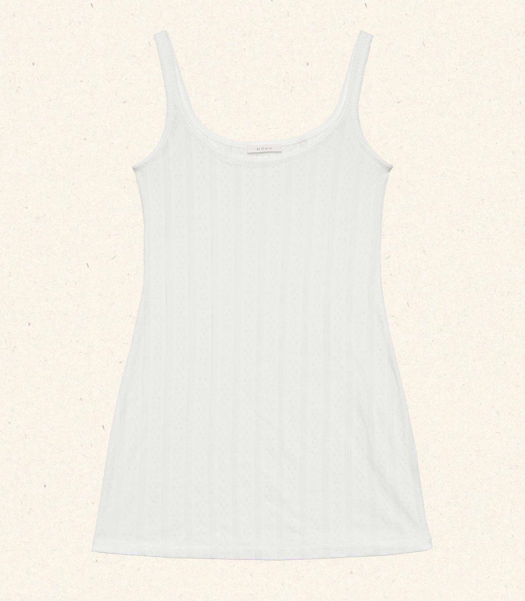In soft organic cotton pointelle, the Cynthia Dress is an effortless pullover style with a fitted silhouette, mini hemline, slender straps, and a scoop neckline trimmed with delicate elastic lace.