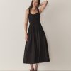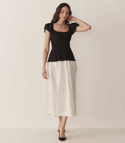 In a crisp organic cotton poplin, the Enya Dress features a scoop neckline, a gathered bust, short puffed sleeves, and a smocked bodice. A third gathered panel finishes just below the hips, flaring out into an ankle-length skirt, while elastic lends give to the short puffed sleeves, bust, and waist.