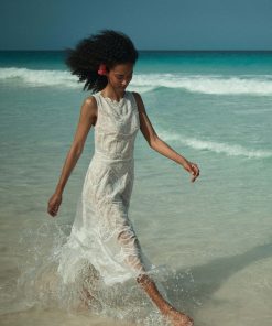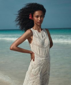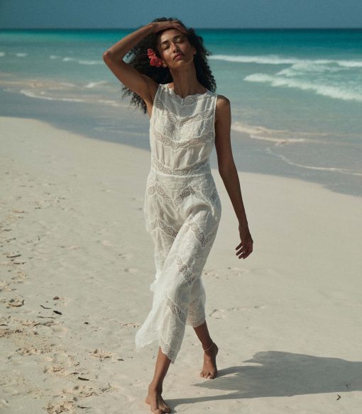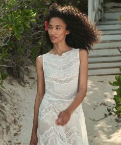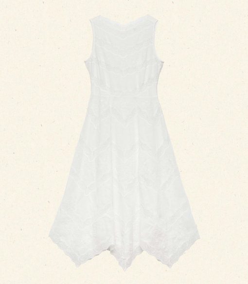 Drawing inspiration from Victorian-era lawn party dresses, the DÔEN Heirloom Evanora Dress is a breezy silhouette with a high, subtle V-neckline and midi-length handkerchief hem. The bodice and skirt are adorned with intricate embroidery and inset chevron lace panels, while an invisible side-seam zipper offers the perfect fit.