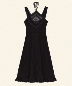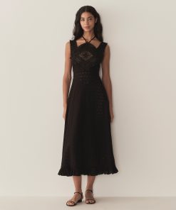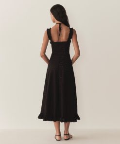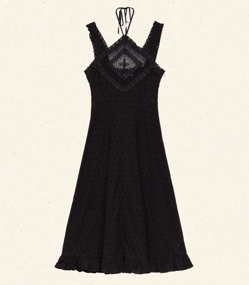 Crafted from cotton with an allover embroidered eyelet design, the Frieda features a diamond-shaped bodice inspired by an antique corset cover, threaded with a grosgrain ribbon that ties at the neck as a halter strap. A fitted bodice with princess seams gives way to an ankle-grazing A-line skirt finished with a ruffled hem.