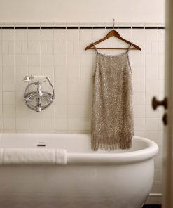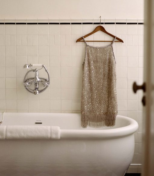 Inspired by the eveningwear of 1960s starlets, the DÔEN Heirloom Gala Dress is an extra-special treasure, expertly hand-beaded by artisans in India, with each dress taking three days to bead. Crafted in a silk organza with intricate allover glass beading, it’s detailed with rhinestone chains at the straps and neckline and a beaded fringe at the hem.