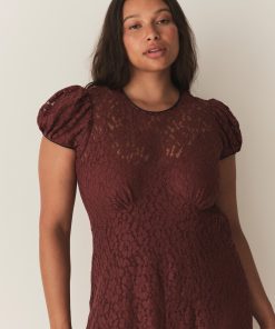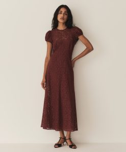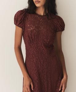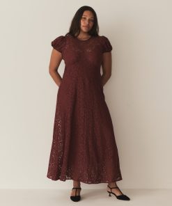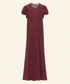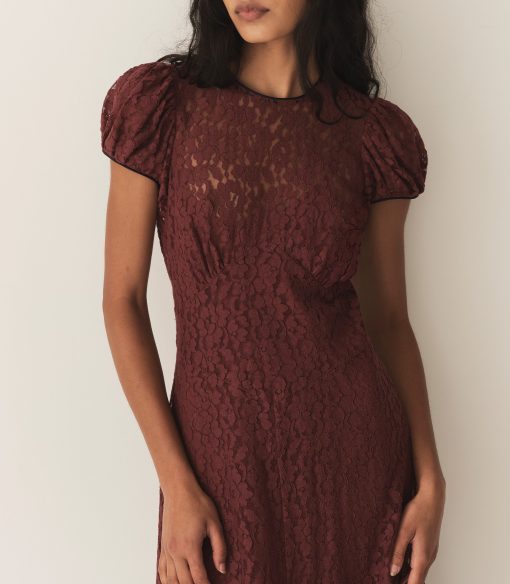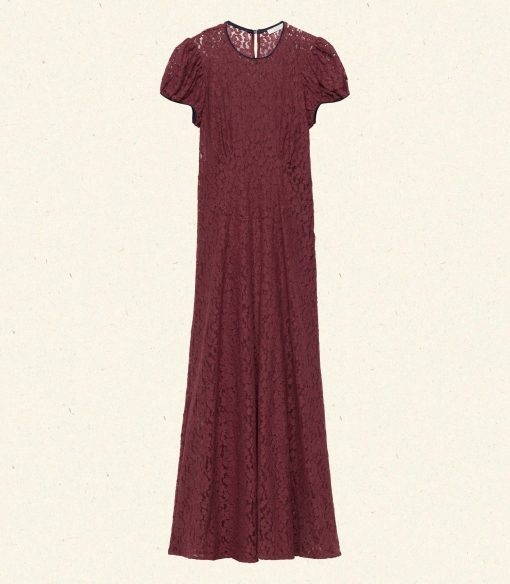 In intricate allover floral lace, the ‘30s-inspired Katarina Dress features a high neck and short puffed sleeves trimmed with contrast piping, pointed underbust seams for structure, and a detachable viscose slip. A fitted waist with an invisible side zipper gives way to an ankle-grazing A-line skirt, while a single button with a keyhole detail fastens at the back of the neck.