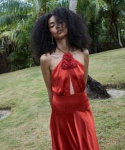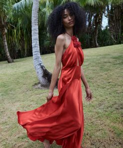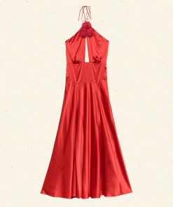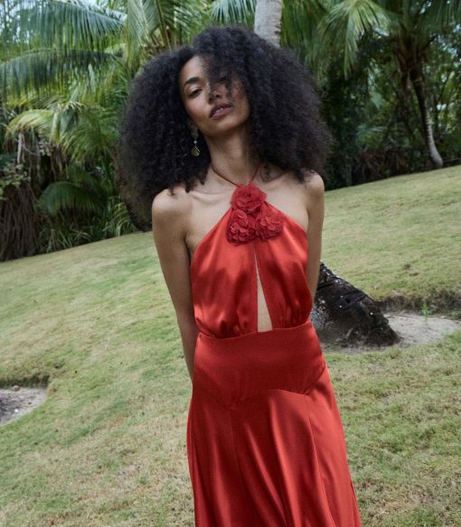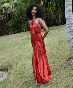 The ‘30s-inspired Lilaia Dress is a shimmering silk-satin treasure, featuring a high halter neck adorned with removable flower brooches, a low V-shaped back, and cut-out details at the bodice. A fitted waist with an invisible side zipper gives way to an ankle-grazing, bias-cut skirt.