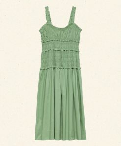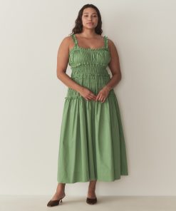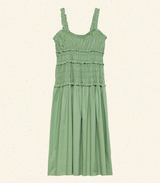Crafted from crisp organic cotton poplin, the Marianne Dress features a square neckline, a gathered bust, and a fitted bodice framed with petite ruffles. A third gathered panel finishes just below the hips, flaring out into a full-length skirt, while elastic lends give to the straps, bust, and waist.