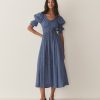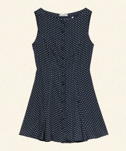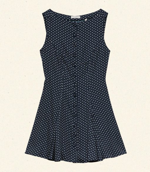 nTaking cues from our best-selling Aubrey Dress, the silk-viscose twill Monette Dress is a sleeveless style with a bateau neckline and swingy mini hemline, adorned with our playful navy-and-white Hepburn Dot. Princess seams lend structure to the bodice, while a back waist tie allows you to adjust the fit. Self-covered buttons extend down the front.