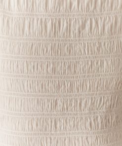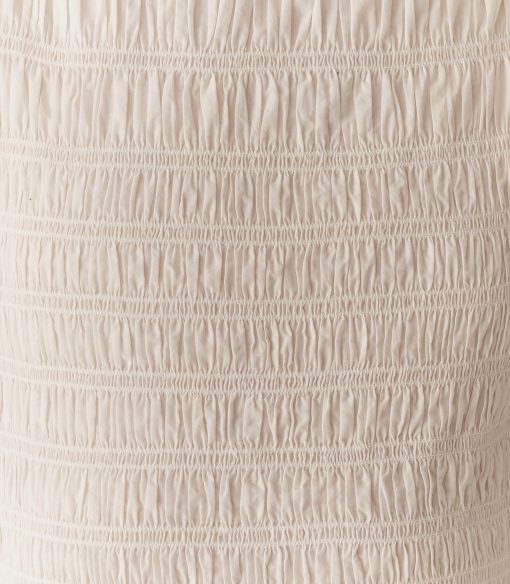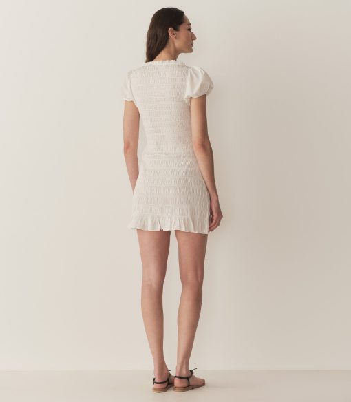 Rendered in a crisp organic cotton poplin, the Rizzo Dress is a pullover style with a bateau neckline, short puffed sleeves, and allover elasticized smocking. A fitted silhouette gives way to a mini-length skirt with a ruffle at the hem.