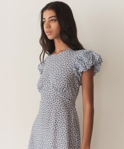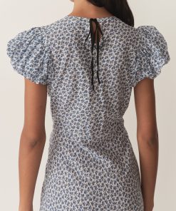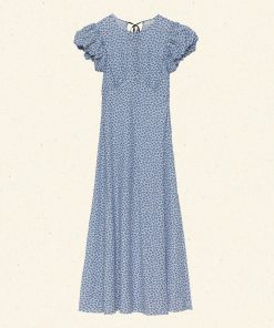Crafted in a soft, lightweight organic cotton voile and adorned with our Cornflower Hillside Bloom, the Romina features a high neck and short puffed sleeves. The bodice is detailed with pointed underbust seams for structure, giving way to an ankle-grazing bias-cut skirt, and a delicate grosgrain ribbon ties at the back.