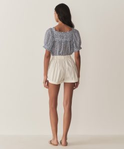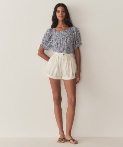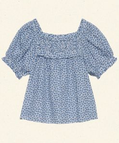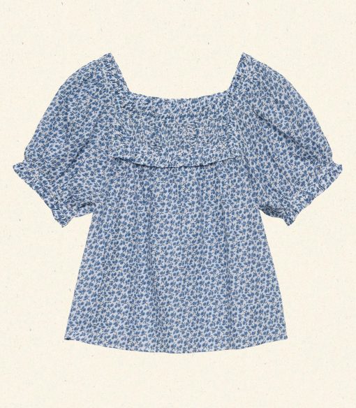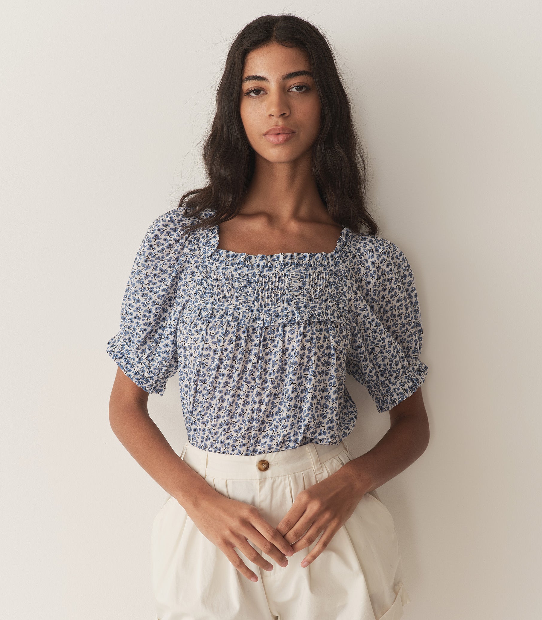 Crafted in a soft, lightweight organic cotton voile and adorned with our Cornflower Hillside Bloom, the Frances Top—which we first designed in 2019—is a Favorite Character featuring a breezy silhouette, a square neckline, and short puffed sleeves trimmed with petite ruffles. A square yoke is adorned with alternating panels of ruching and pintucks. Wear it loose, or tuck it into your favorite pair of high-waisted jeans.