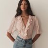 Crafted from the softest organic cotton voile, the Edwardian-inspired Henri Top—which made its debut in Spring 2018—is a Favorite Character we find ourselves returning to again and again. It features a plunging V-neckline framed with cascading lace-trimmed ruffles that extend down the bodice and delicate clustered pintucks at the yoke, back, and short puffed sleeves. A line of hidden starburst buttons run up the center front.