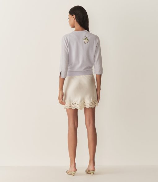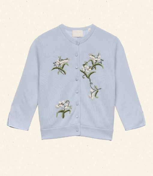 Inspired by knits from the ‘50s, the DÔEN Heirloom Teresa Cardigan—made from the softest blend of wool and cashmere with a satin lining—features skillfully hand-embroidered lily of the valley flowers, satin piping at the sleeve opening, and satin covered dome buttons.