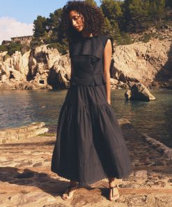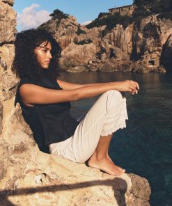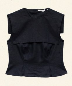 Tailored in soft midweight linen, the ‘60s-inspired Margie Top is a sleeveless style with a wide square sailor-style collar. A fitted silhouette is adorned with waist darts and box pleats for structure, while self-covered buttons extend down the back.