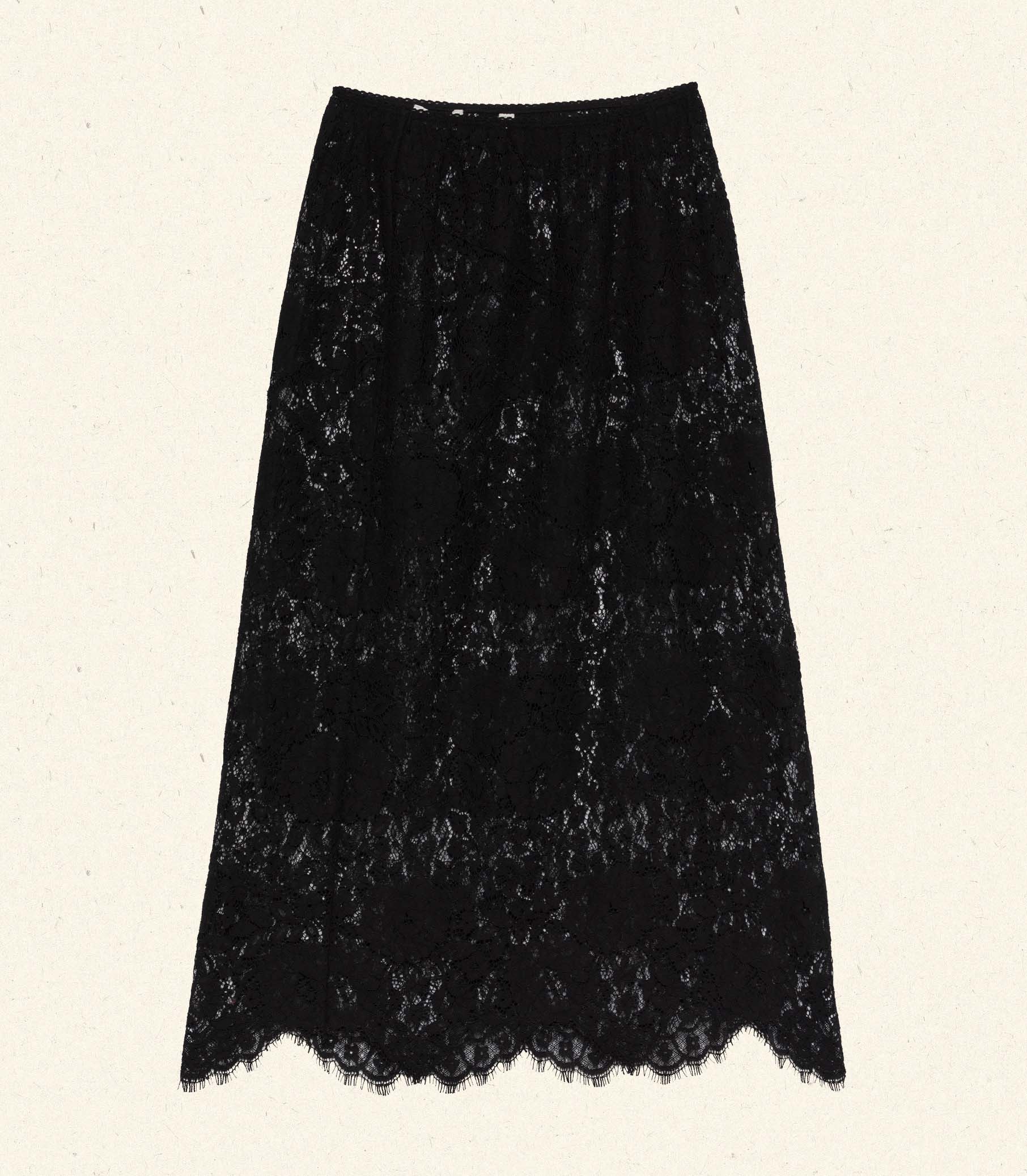 In an intricate allover lace, the Nandi Skirt—a favorite of our co-founders Margaret and Katherine—features ‘30s-inspired seam details, scalloped elastic at the waist, and an uneven hemline.