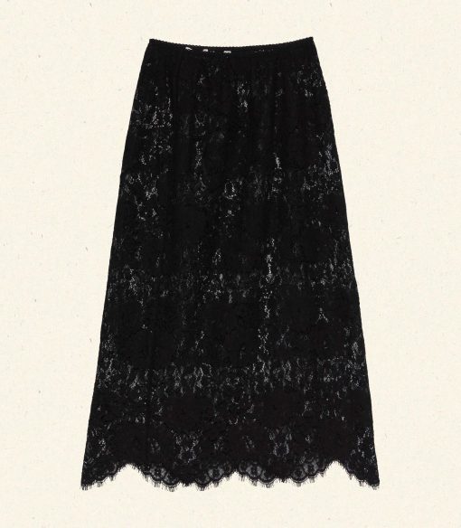 In an intricate allover lace, the Nandi Skirt—a favorite of our co-founders Margaret and Katherine—features ‘30s-inspired seam details, scalloped elastic at the waist, and an uneven hemline.