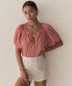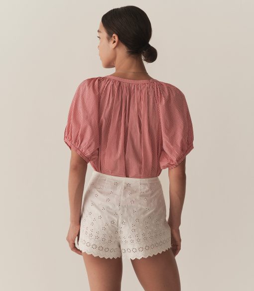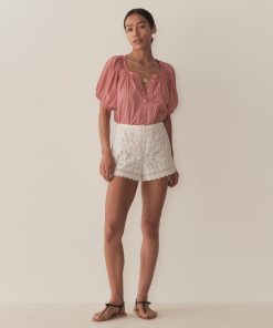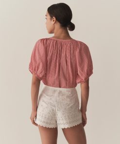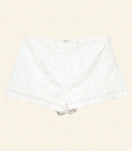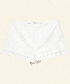Crafted from soft, lightweight organic cotton and rendered in an allover embroidered eyelet design, the Arbre Short—a favorite of our co-founders, Margaret and Katherine—features an A-line cut, an ultra-high waist with an invisible side zipper and hook-and-eye closure, allover eyelet detailing, and scallop eyelet trim at the hem.