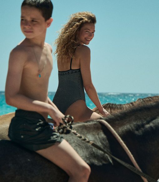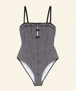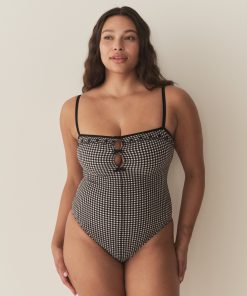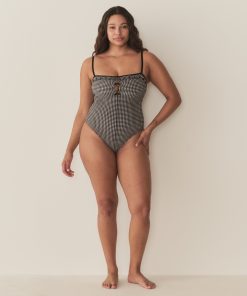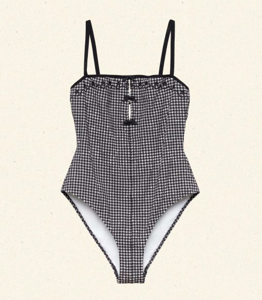 Inspired by 1950s swimwear, the Adrielle Maillot is a classic one-piece crafted from a stretchy seersucker adorned with our La Maddalena Gingham and fully lined for a smooth fit. With a square neckline, medium coverage cut, and stretchy grosgrain straps, it’s detailed with black floral eyelet embroidery, contrast piping, and three fixed bows that extend down the bust. Zigzag stitches adorn the edges.
