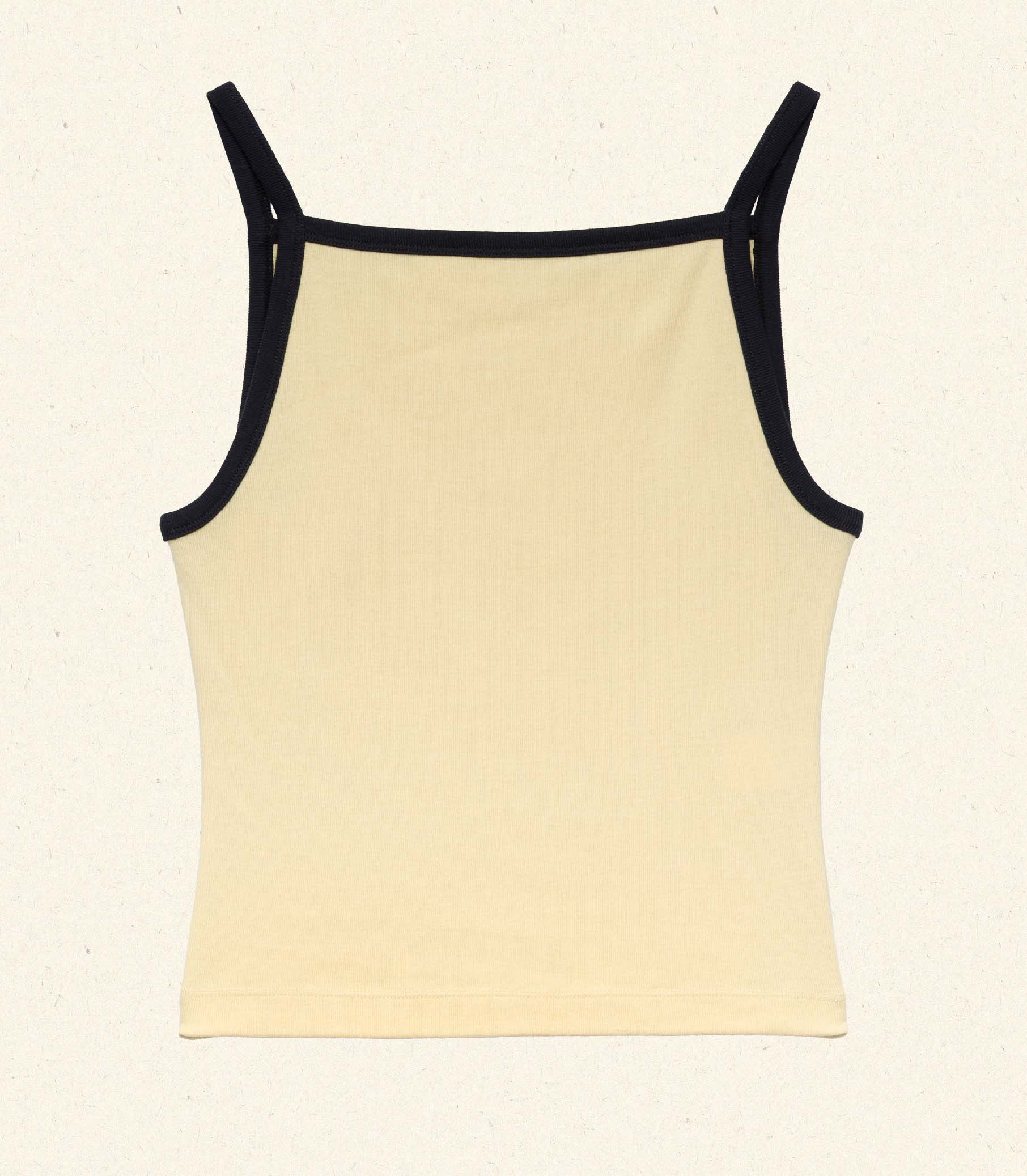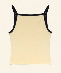 Crafted from a soft blend of regenerative and recycled cotton, the ‘90s-inspired Angie Ringer Tank features a fitted silhouette with navy contrast trim along the high square neckline and spaghetti straps.