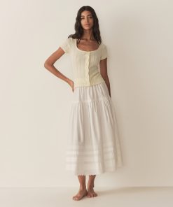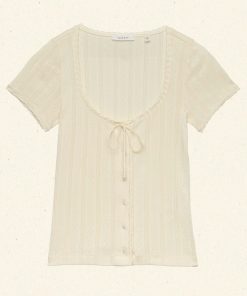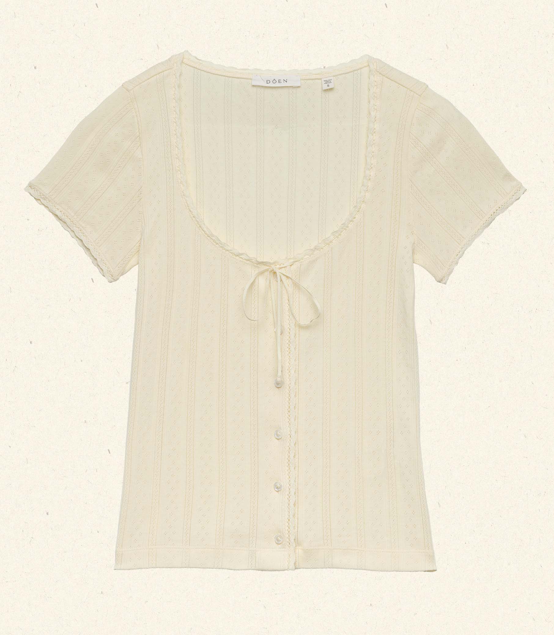 Taking cues from our beloved Lois Tank, the Lara Tee is crafted in the softest organic cotton pointelle, featuring fitted silhouette, cap sleeves, and a scoop neckline trimmed with delicate scallop detailing. Mother-of-pearl buttons run down the center front.