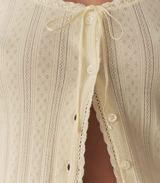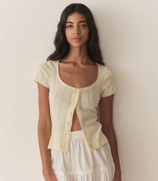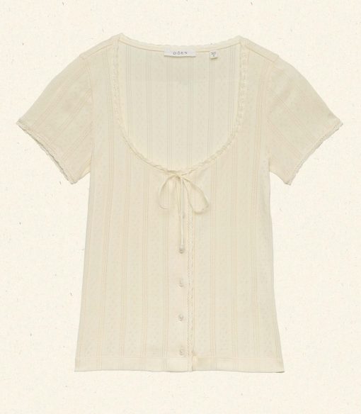 Taking cues from our beloved Lois Tank, the Lara Tee is crafted in the softest organic cotton pointelle, featuring fitted silhouette, cap sleeves, and a scoop neckline trimmed with delicate scallop detailing. Mother-of-pearl buttons run down the center front.