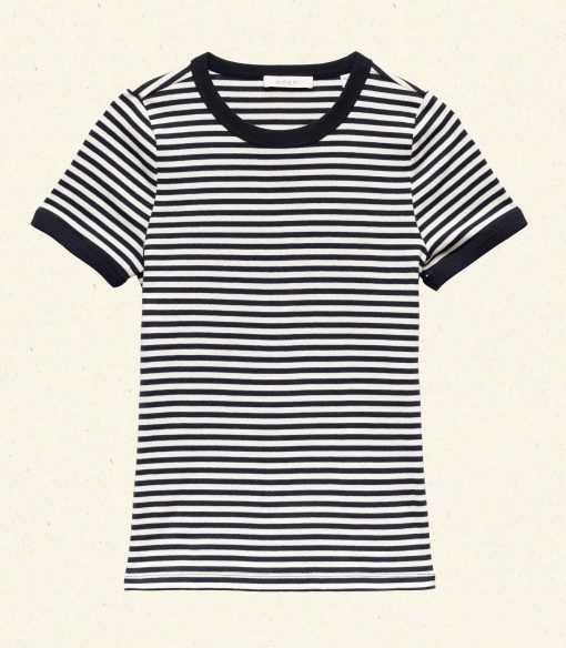 Crafted from a soft blend of regenerative and recycled cotton and rendered in our nautical navy-and-white Nantucket Stripe, the Vivi is our take on a ‘90s-style baby tee. It features short sleeves, a classic crew neck, and a fitted silhouette.