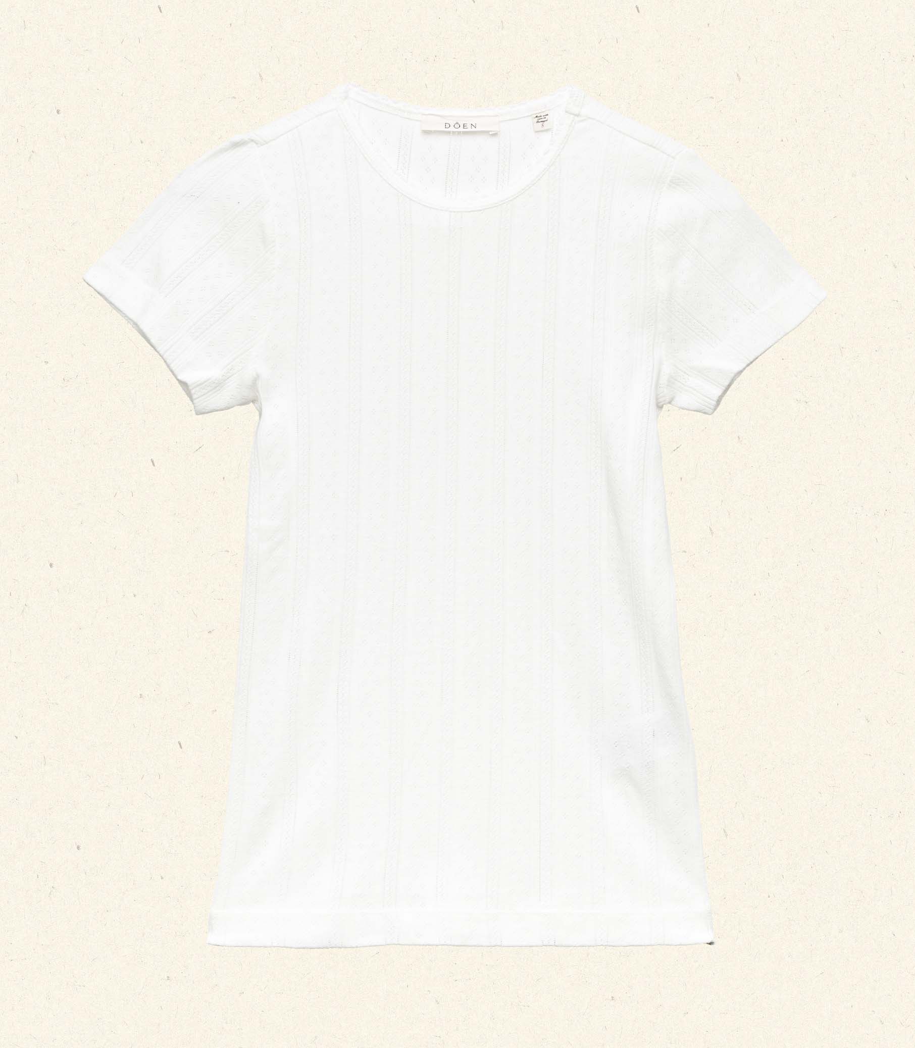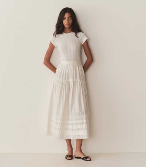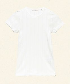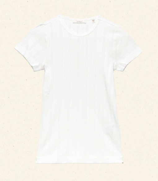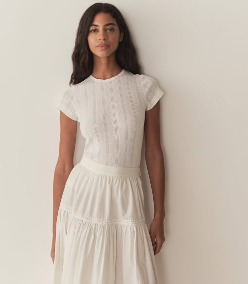 Crafted from the softest organic cotton pointelle, the Vivi Tee is a ‘90s-inspired baby tee with a fitted silhouette, short cap sleeves, and delicate scalloping along the neck opening.